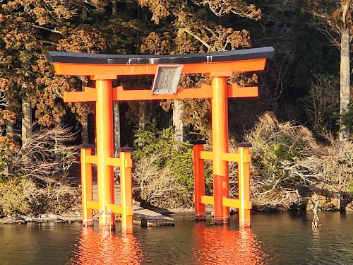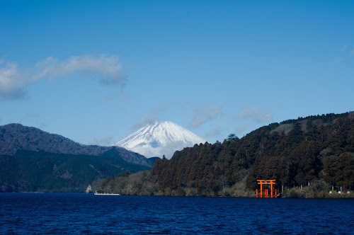 Scenic caldera lake formed by the Hakone Volcano. Sightseeing boats offer stunning views of Mount Fuji. The area is popular for fishing, ropeways, and walking trails, highlighted by the iconic red torii of Hakone Shrine.