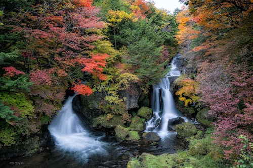 Experience stunning multiple cascades and vibrant seasonal colors at this enchanting waterfall in Nikko.